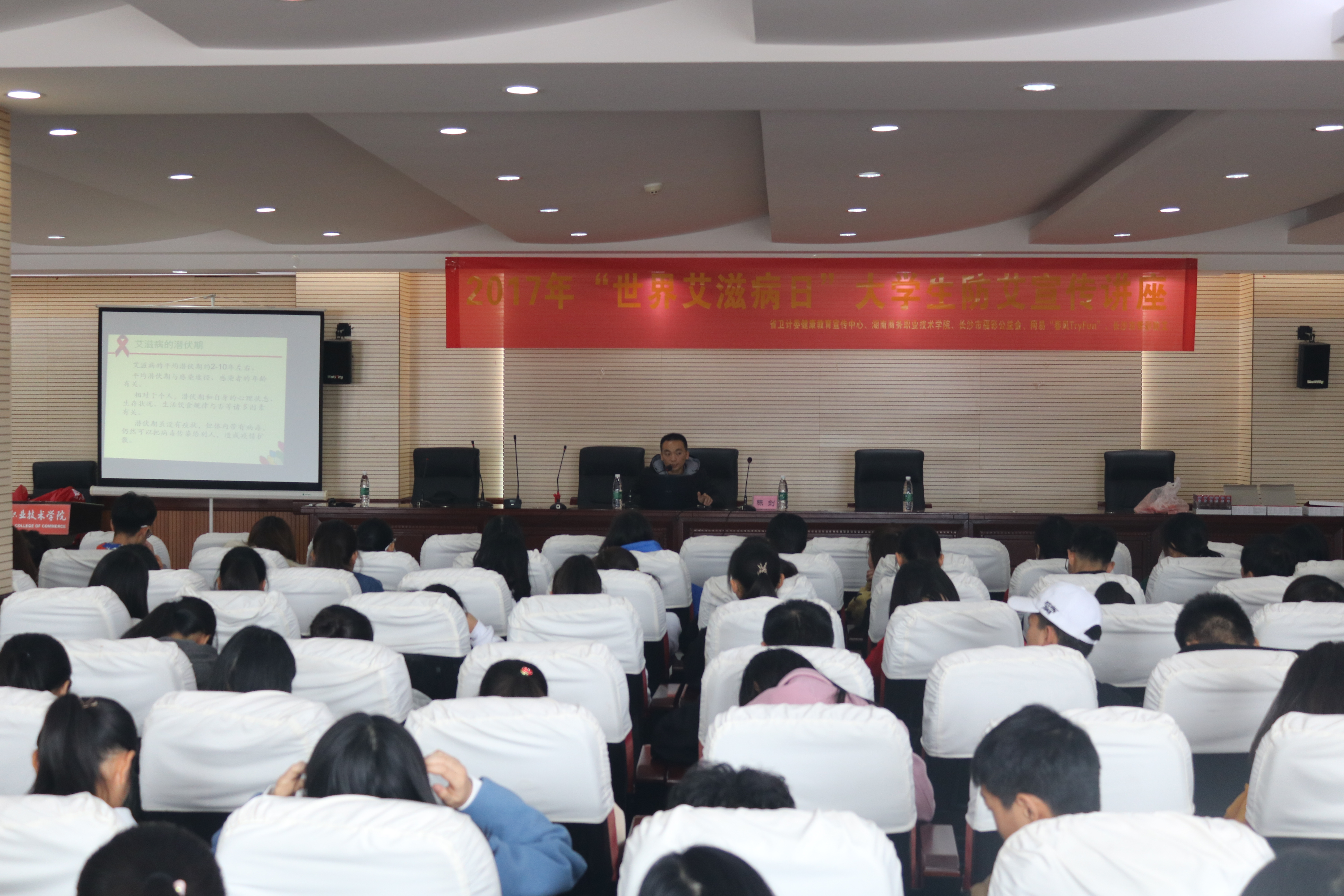 在近1个半小时的讲座过程中,长沙市疾控中心性艾科科长负责人通过图文并茂的方式就艾滋病的基本情况、青年大学生的艾滋病流行情况、艾滋病的传播途径、如何预防艾滋病、拒绝新型毒品、国家对艾滋病的相关政策等专业知识进行了讲解。讲座中指出“艾滋病距离每一个大学生并不遥远,作为青年大学生群体不仅要了解艾滋病相关知识,更重要的是要做到“知行合一”,拒绝诱惑”。